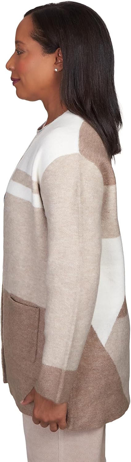 Throw on this colorblock cardigan for the perfect layered look. Featuring front patch pockets