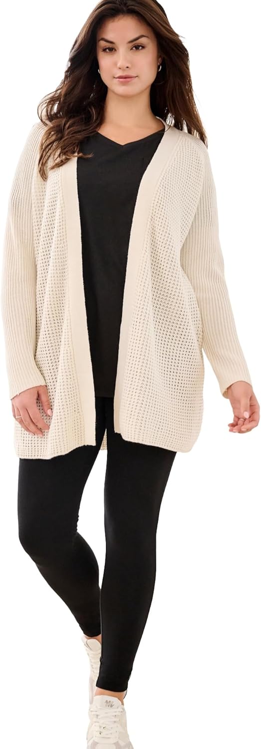 This Open Front Long Ribbed Sleeve Plus Size Women's Waffle Cardigan adds a touch of classic style to your outfits. This cardigan is crafted in a richly textured, soft and cozy waffle knit, and comes in a variety of colors so you can coordinate one with every outfit. Pair it with jeans, skirts, dresses or chinos. FIT 34" length; Hits at mid-thighbr>Relaxed fit FEATURES Ribbed placket and sleevesbr>Waffle-stitch bodybr>Long raglan sleevesbr>Thoughtfully designed without pockets to maintain its soft drape and flattering fit FABRIC Super soft acrylic knitbr>Machine washablebr>Imported ?? WHY YOU'LL LOVE IT. Sophisticated, stylish and comfortable, you'll live in this cardigan from season to season. Exclusively Ellos, Designed Just For You. Directly from Sweden, Ellos is an expertly curated collection of effortless styles and feminine prints available in sizes 10-44. MORE STYLES TO SHOP