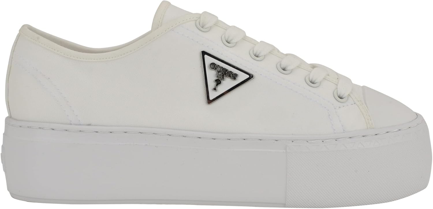 The Guess Joezi gives a casual dress-up-or-down appeal. This platform sneaker is accented with a signature Guess triangle logo that is ready to wear with jeans or a dress.
