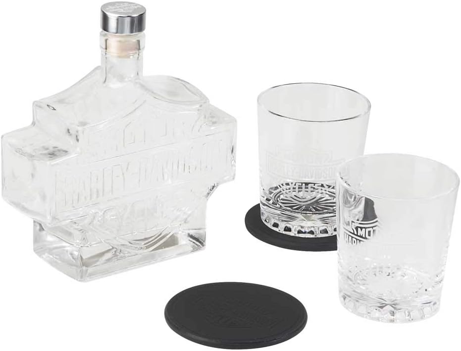 Harley-Davidson Bar & Shield Decanter Set, HDL-18746. Lift your spirits and impress your guests with a Harley-Davidson Bar & Shield Decanter Set. Perfect for casual or formal entertaining the sophisticated styling is sure to be the center of attention. Complete set includes hand blown 750 ml Bar & Shield shaped decanter, two 10 oz. rocks glasses with etched Bar & Shield logo, and two black leather coasters (4" diameter) with embossed Bar & Shield logo. Decanter Dimensions: 6.75" (W) X 7" (H) X 2.5" (D). HDL-18746
