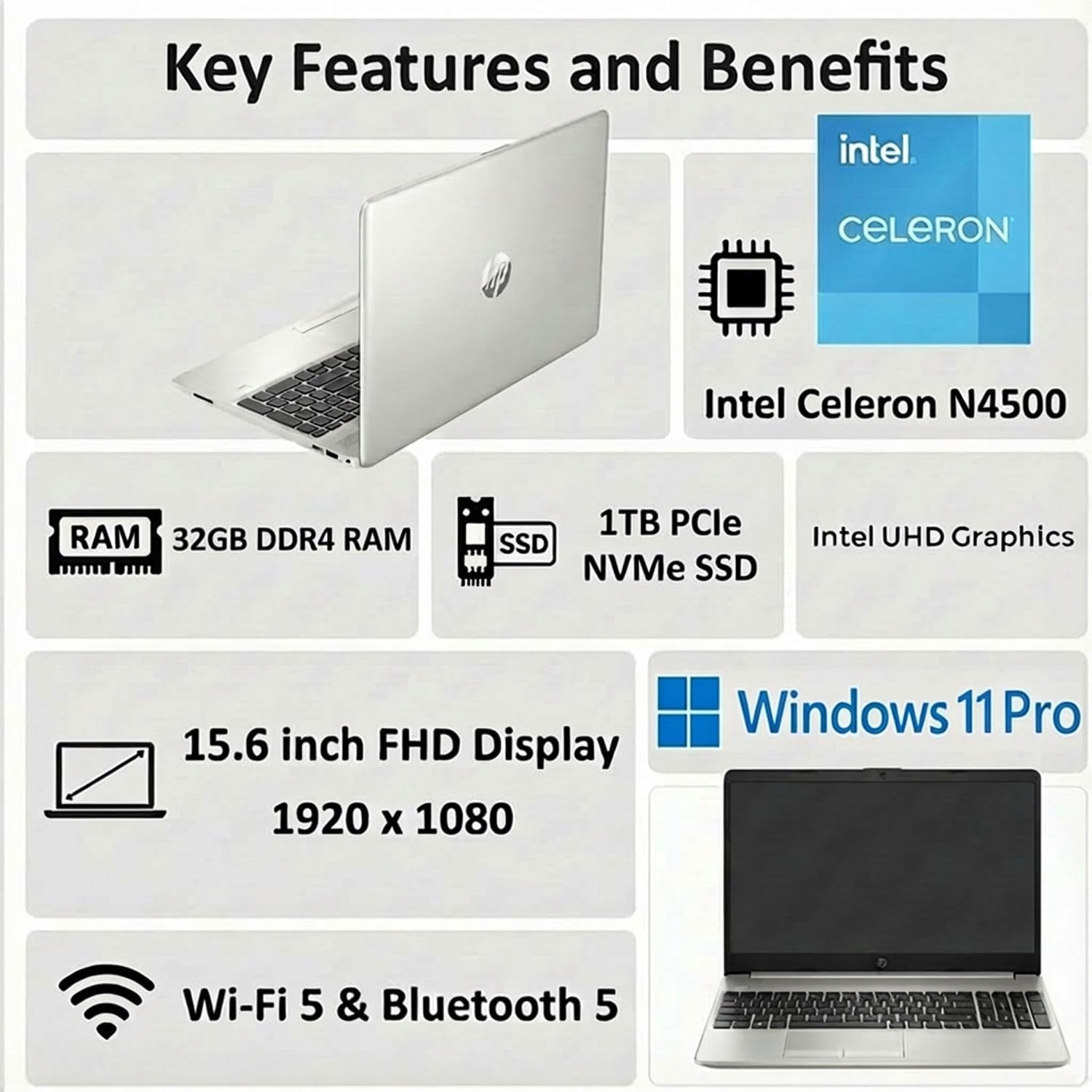 Processor: Intel Celeron N4500 Processor Graphics: Intel UHD Graphics Operating System: Windows 11 Pro Memory: 32GB DDR4 SDRAM Hard Drive: 1TB PCIe Solid State Drive Display: 15.6" diagonal, FHD (1920 x 1080), SVA, narrow bezel, anti-glare, 250 nits, 45% NTSC Connectivity: Wi-Fi 6 and Bluetooth 5.2 Audio: High Definition (HD) Audio Keyboard: English Keyboard Webcam: 720P HD camera Ports: 1 x USB Type-C 5Gbps signaling rate 2 x USB Type-A 5Gbps signaling rate 1 x stereo headphone/microphone combo jack 1x HDMI 1.4b 1 x RJ-45 1 x SD Media Card Reader Battery: 3-cell, 41 Wh Li-ion polymer battery Upto 8 hours and 20 minutes video playback battery life, 45 W power adapter Color: Asteroid Silver Dimensions (L x W x H): 14.09 x 9.53 x 0.78 inches Weight: 3.84lbs