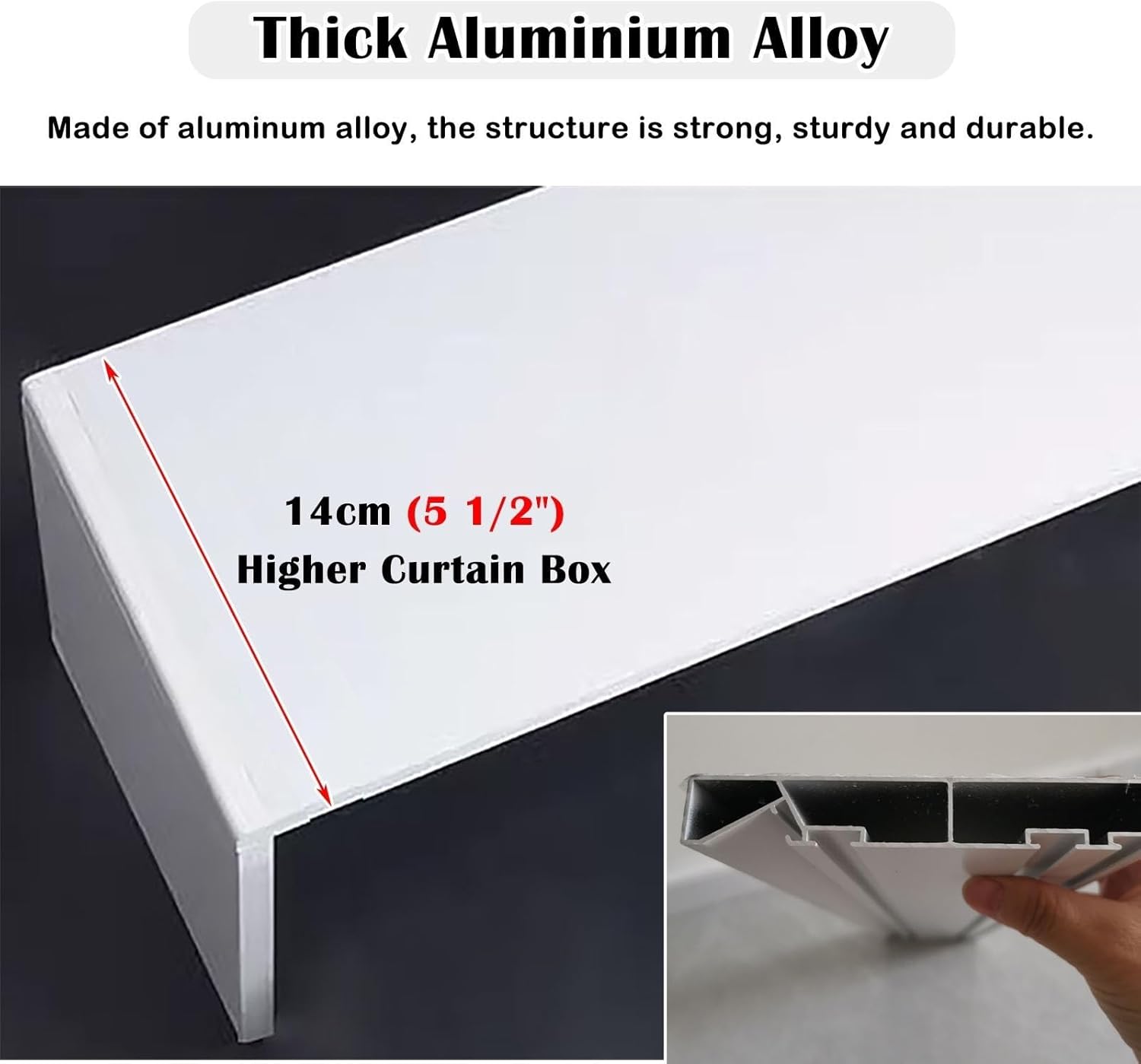 **Specifications:** - **Material:** Durable Thick Aluminium Alloy - **Compatibility:** Suitable for Single Curtain Track - **Length:** Adjustable from 38 to 96 inches (97 to 244 cm) - **Height:** 14 cm (5 1/2 inches) - **Width:** 10 cm (4 inches) - **Customizable:** Yes - **Cuttable:** Yes **Product Features:** - Available in multiple sizes to perfectly fit any window or room. - Provides the privacy and light control you desire, making it suitable for bedrooms, living rooms, balconies, and terraces. - Designed to blend seamlessly with your décor, offering a clean and sophisticated appearance. - A versatile solution that accommodates a wide range of window and bay window sizes, enhancing both functionality and style. - Note: Lengths beyond 1.5 m will be cut due to logistic constraints. **Package Includes:** - 1 x Curtain Box - All necessary Mounting Accessories
