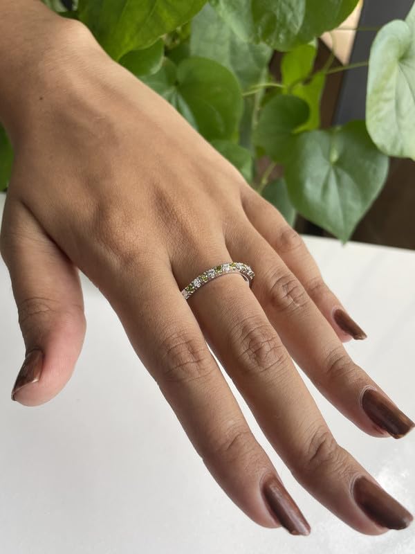 This Band Crafted in 925 Sterling Silver, available in 14K White, Yellow and Rose Gold Plating. Round Cut simulated Peridot & White Diamond set in prong setting.