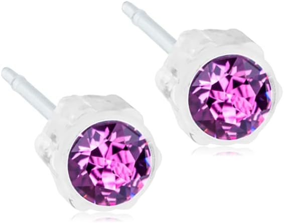These tiny crystal stud earrings have 0% NICKEL! These 4mm small crystal medical plastic stud earrings were developed in consultation with skin specialists that guarantee comfort all day. A charming crystal set in skin-friendly medical plastic. The 4mm measurement is of the entire setting. Blomdahl earrings are sold by the pair with backs and come in a Clean Pack. In the transparent Clean Pack bubble, one pair of the 4mm small crystal stud earrings is hygienically packed. The label is a seal which guarantees that you are the first person to wear your new earrings.*Important: Do not clean medical plastic earrings with alcohol or peroxide. It can turn them yellow and brittle. Use a gentle soap and water for cleaning.Available Colors ( in the order of the Swatches) : Violet, Crystal, Rainbow, Rose, Sapphire, Aquamarine, Amethyst, Peridot, Light Rose, Black Diamond, Golden Shadow, and Blue Zircon.