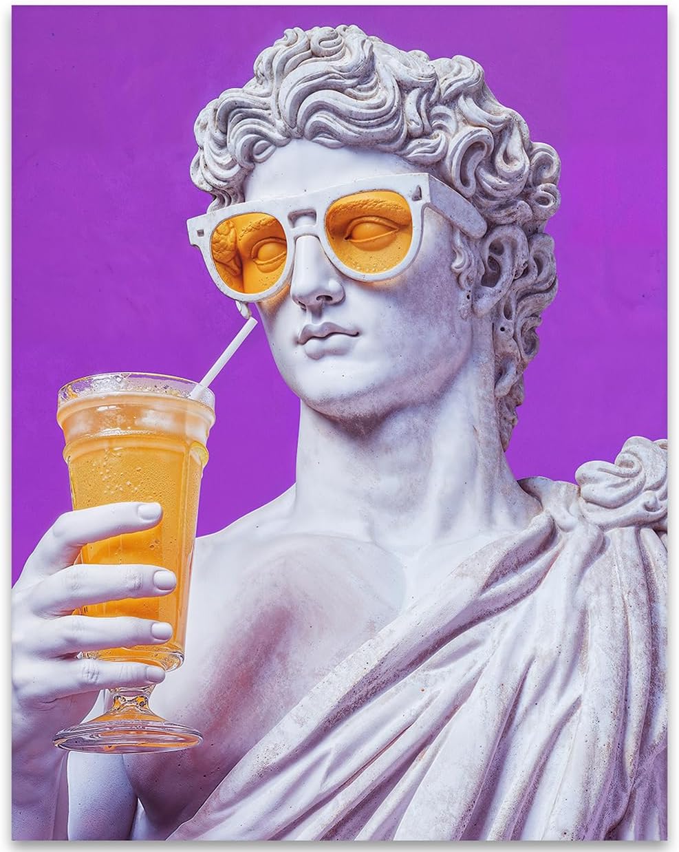 The Cool Greek God modern pop art statue poster is a vibrant addition to any room, making it a fantastic gift for loved ones on various occasions like birthdays, Christmas, or housewarming parties. This quirky and fun artwork features a humorous Greek sculpture wearing sunglasses and sipping an orange drink, combining retro and modern styles with its playful purple and orange pop culture design. This stretched canvas poster is ready to hang, making it suitable for living rooms, dens, kitchens, or dorms. Crafted using quality pine 1.5" stretcher bars, this bold and vibrant modern wall art reflects the dedication of our hard-working team in Tomball, TX, who take pride in delivering quality products. With its unique blend of classical and contemporary art, this fun piece adds a touch of creativity to your decor while capturing the essence of summer vibes.