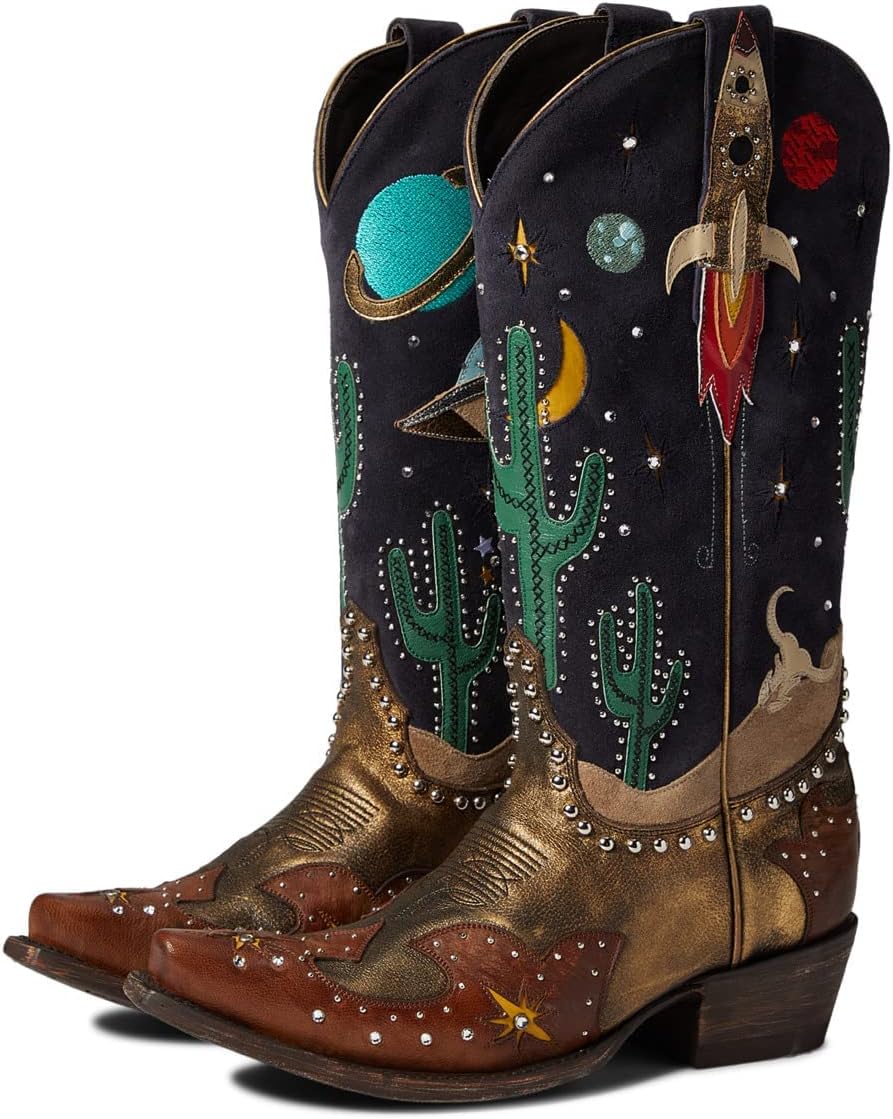 Distinctively stylish Copper Blue leather boots, adorned with bold, unique Western details, silver studs, and crystal accents, boasting a planetary theme. The color treatment's undertone lends a vintage, used appearance. Deep scallop cut shaft, intricate pull tab shapes, and overlays make these boots a detailed, must-have addition to your fun Old Gringo collection.