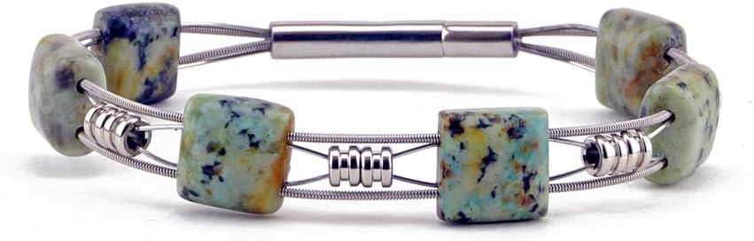 Strike a chord with the Emily Guitar String Bracelet from Retuned Jewelry. This unique piece features an eye-catching design of crisscrossing used guitar strings, beautifully complemented by stone beads and authentic guitar string ball ends. This bracelet creates a perfect fusion of music and fashion, making it an ideal accessory for both casual and statement looks. Each bracelet showcases the distinctive pattern of interwoven strings, creating a one-of-a-kind piece that celebrates musical heritage in wearable form. The stone beads adds a pop of color and natural beauty to this rock-inspired design. Whether you're a musician, music lover, or someone who appreciates unique jewelry, this bracelet lets you carry a piece of rock and roll spirit wherever you go.